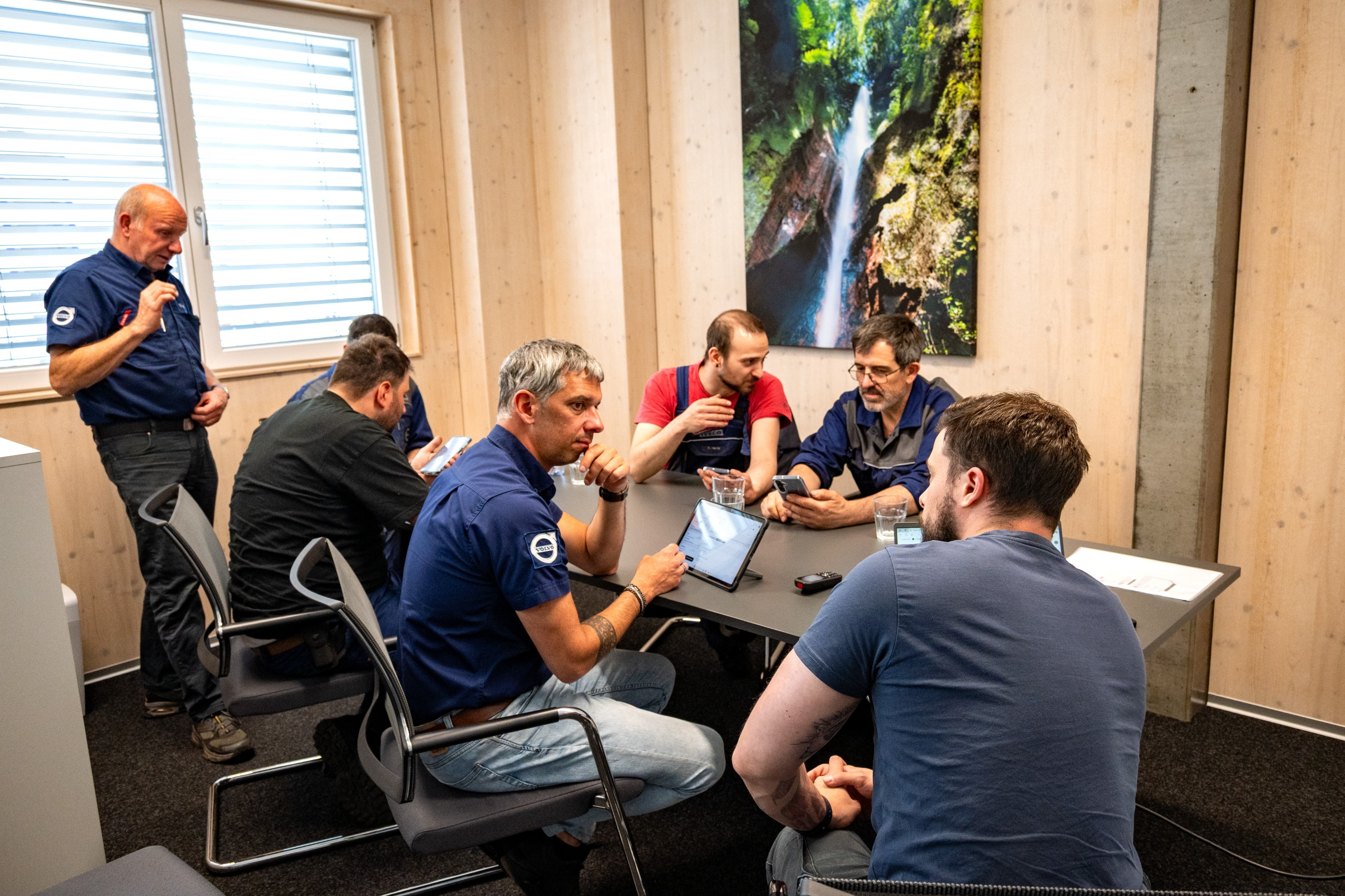 19.05.2025: Wir stellen die Werkstatt auf «Paperless» um. Der Start ist mit viel Umsetzungs- und Einrichtungsarbeit verbunden, aber die vielen Vorteile werden schon bald für alle überwiegen. Letzten Freitag war der Theorieteil und unsere Werkstatt-Profis machten die ersten (Arbeits-)Schritte mit dem Natel als neues Arbeitsgerät. Ab heute werden wir uns noch mehr in das neue App, welches uns von Volvo zur Verfügung gestellt wird, einarbeiten.
